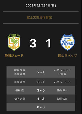2023-12-24 一般社団法人Tリーグ ノジマTリーグ 2023-2024シーズン 公式戦 12月24日開催 静岡ジェード vs 岡山リベッツ 試合結果 Tweet ノジマTリーグ 2023-2024シーズン 公式戦 12月24日開催「静岡ジェード vs 岡山リベッツ」の試合は3-1で静岡ジェードが勝利しました。 企業プレスリリース詳細へ PR TIMESトップへ 公式ツイッター Follow @Straightpress 最新情報をTwitterで受け取ろう! 公式フェイスブックページ 最新情報をFacebookで受け取ろう! 前の記事 一覧へ戻る 次の記事