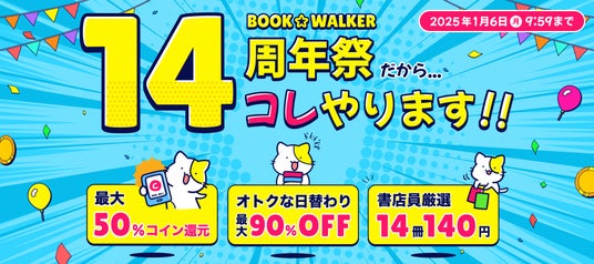株式会社ブックウォーカー(本社:東京都千代田区 代表取締役社長:森田岳)は、総合電子書籍ストアBOOK☆WALKERにて、サービス開始14周年を記念したキャンペーン「BOOK☆WALKER14周年祭だから…コレやります!!」を2024年12月6日(金)から2025年1月6日(月)まで開催します。
