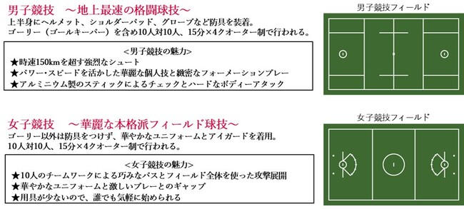 棒の先に網のついたスティック (クロス) でテニスボール大の硬質ゴム製のボールを運び、約180cm 四方のゴールへシュートし得点を競う団体球技です。両チーム10人、15分×4クォーター制で、サッカーとほぼ同じサイズのフィールドで競技が行われます。