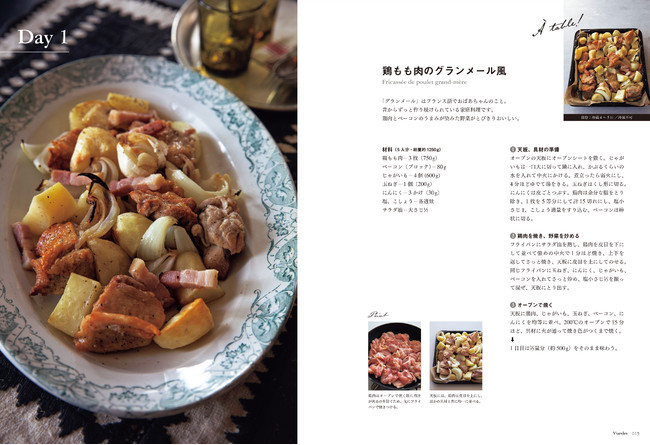 カバーの料理は、白いんげん豆をベーコンで煮たら、1日目はそのまま食べ、2日目はソーセージとトマトを加えてオーブン焼きに。3日目はミキサーにかけ、ピュレにしてパンを添えていただきます。