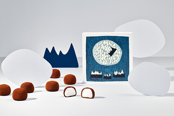 パッケージデザインには、山の版画家大谷一良氏の作品をブランドのメインモチーフにしており、Vカットと呼ばれる高級感あふれるジュエリーのような箱で、バレンタインという特別な日に開ける瞬間からワクワクとした高揚感を味わえます。