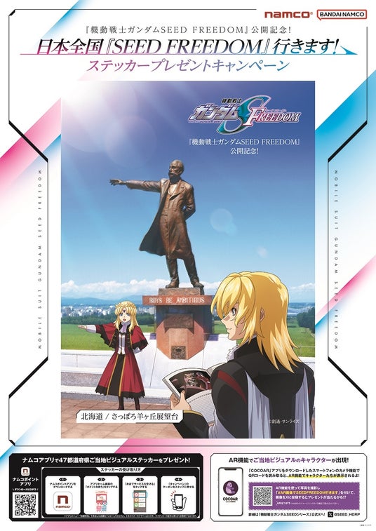 スマホアプリ「ナムコポイントアプリ」内のクーポンをスタッフに提示すると、『機動戦士ガンダムSEED FREEDOM』に登場するキャラクターたちが日本全国を視察する様子が描かれた47都道府県ご当地ビジュアルのステッカーを受け取ることができます。※岩手県・山梨県・鳥取県・島根県の4県については、アニメイトの対象店舗にて実施します。