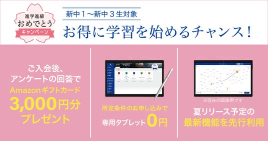 Amazonギフトカード3,000円分プレゼントのほか、所定条件を満たしたお申し込みでZ会専用タブレットを0円で購入できるなど、さまざまな形で“春から新しい学習を始めるあなた”を応援します。