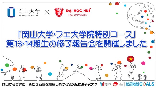 国立大学法人岡山大学(本部:岡山市北区、学長:槇野博史)は2023年3月3日、ベトナム国フエ大学との共同教育プログラム「岡山大学・フエ大学院特別コース」第13期生・第14期生の修了報告会を開催しました。