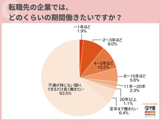 転職先の企業で働きたい年数は、「不満が特にない限り、できるだけ長く働きたい」が63.5%で最多。転職先の企業で、長く働くことを希望する20代が6割を超えました。一方、次いで回答を集めたのは、「4~5年ほど」10.2%、「2~3年ほど」9.0%となっています。転職先の企業で働きたいと考える人が多い一方、転職を重ねることでキャリア形成を図ることを予め考えている人も一定の割合でいることが分かります。