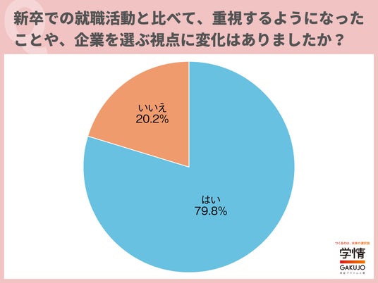 新卒での就職活動と比べて、重視するようになったことや、企業を選ぶ視点に「変化があった」と回答した20代が79.8%に上りました。約8割の20代が、就職活動のときとは異なる視点で企業を選んでいることが分かります。