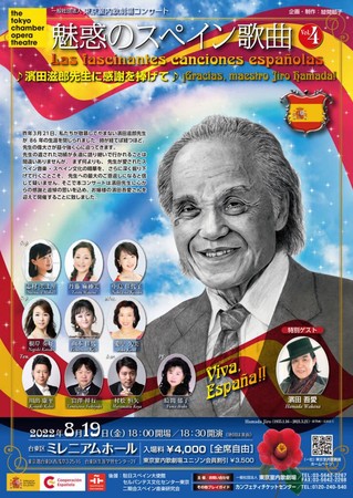 一般社団法人東京室内歌劇場(東京都中央区、代表:杉野正隆)主催、『魅惑のスペイン歌曲Vol.4 ♪濱田滋郎先生に感謝を捧げて♪』が2022年8月19日 (金)に台東区ミレニアムホール(東京都台東区西浅草3-25-16 2階)にて上演されます。