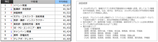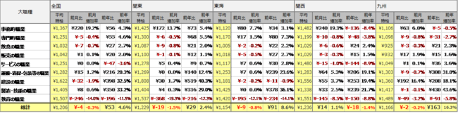 関東エリアの平均時給は1,229円(前月比19円減、前年比29円増)、東海エリアの平均時給は1,154円(前月比9円減、前年比91円増)、関西エリアの平均時給は1,236円(前月比14円増、前年比18円減)、九州エリアの平均時給は1,166円(前月比2円減、前年比163円増)となりました。