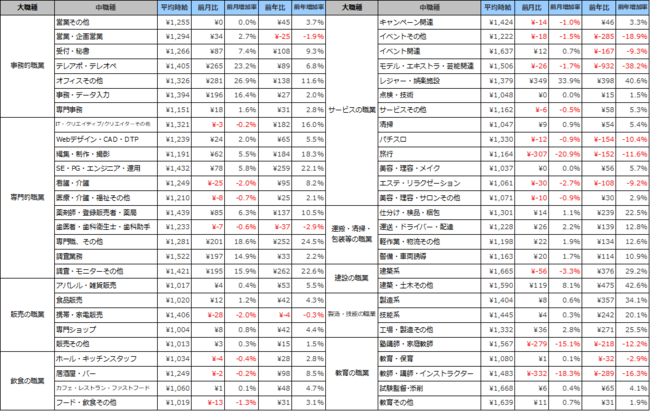 事務的職業の全国の平均時給は1,367円(前月比220円増、前年比56円増)、販売の職業は1,042円(前月比1円増、前年比20円増)、運搬・清掃・包装等の職業は1,282円(前月比15円増、前年比216円増)、製造・技能の職業は1,405円(前月比8円増、前年比350円増)となり、4つの大職種では全てのエリアで前月を上回りました。