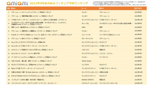 ※2022年9月1日から9月30日の期間中に予約開始されたフィギュアを対象として、自社独自の予約データ(予約数・金額など)を元にランキングを構成しています。