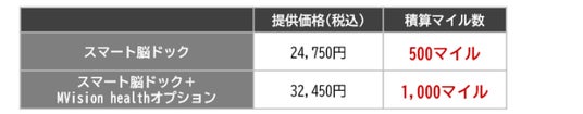 JALマイレージバンクの「JALマイレージパーク」を経由して、「スマート脳ドック」を申し込むと、受診内容に応じたJALマイルを積算します。さらにAIによる脳画像解析を提供する「Mvision health」(※)オプション付きプランもお選びいただけます。