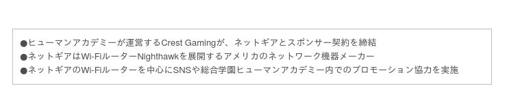 教育事業を手掛けるヒューマンアカデミー株式会社(本社:東京都新宿区、代表取締役:川上 輝之、 以下「当社」)が運営するeスポーツチーム「Crest Gaming」は、ネットギアジャパン合同会社(本社:東京都中央区、代表:杉田 哲也、以下「ネットギア」)とスポンサー契約を締結いたしました。