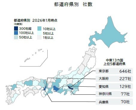 都道府県別(本社所在地に基づく)では「東京都」が最も多い646社だった。「大阪府」(227社)、「愛知県」(129社)が続き、3都府県で全体の6割超を占めた。中東13カ国のいずれかに進出、または輸出入を行う企業は、全国43都道府県で判明した。