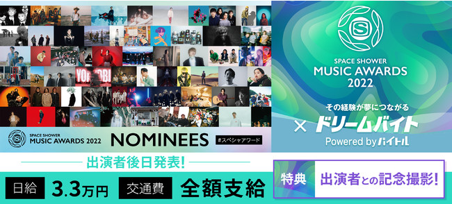 ディップ株式会社(以下「当社」)は、『その経験が夢につながる』をコンセプトとした「ドリームバイト」の新企画として、2022年3月15日(火)に開催される、スペースシャワーTV主催の音楽の祭典『SPACE SHOWER MUSIC AWARDS 2022』をサポートするアルバイトを募集開始しました。