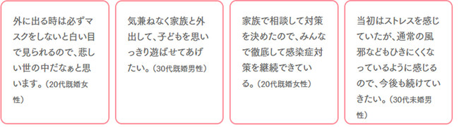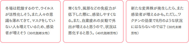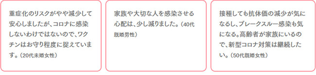 新型コロナワクチンの接種をした生活者に、気持ちの変化を尋ねたところ、「重症化リスクが減って、安心・気が楽になった」「家族や周囲の人に感染させる心配が減った」など、気持ちが軽くなったとの回答があがりました。一方で、「ワクチンを接種しても感染の可能性がゼロになるわけではない」「緊急事態宣言解除後のリバウンド(感染再拡大)がくるかもしれない」「ワクチン効果の減少や新たな変異株登場の可能性」などを理由に、警戒・懸念する声も多数ありました。
