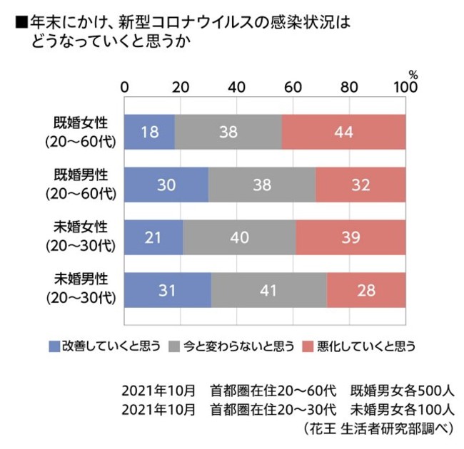 年末にかけての新型コロナウイルス感染状況について、女性は約4割が「悪化する」と考えているのに対し、男性は「改善する」「変化なし」「悪化する」と意見が割れています。