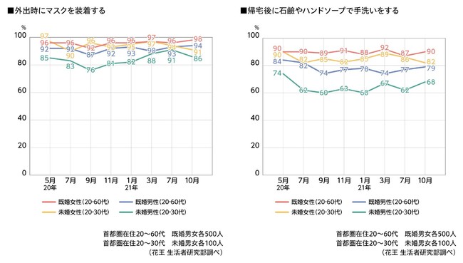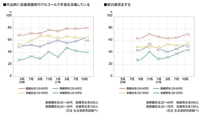 多くの人がワクチン接種を完了し、緊急事態宣言も解除されましたが、これまでと同様に「手洗い・手指消毒・マスク装着」といった感染症対策を継続している人が多い状況です。また、秋になってから「家の換気」を意識的に行っている人が増加傾向にあります。