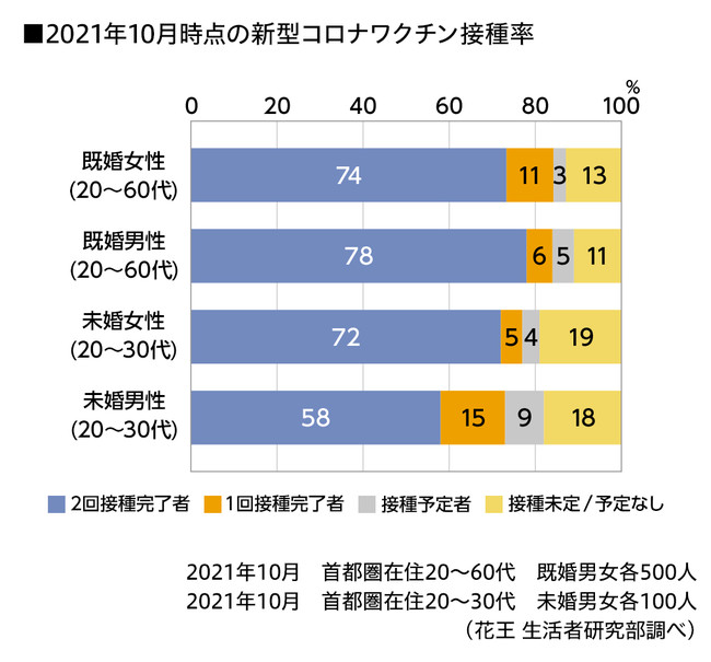 2021年10月時点で、未婚・既婚女性、既婚男性の70%以上が新型コロナワクチン2回目の接種を終えています。未婚男性の接種率がやや低めですが、初期の対象者枠制限による遅れと考えられ、年内には80%以上と、多くの人が2回目のワクチン接種を完了できそうです。