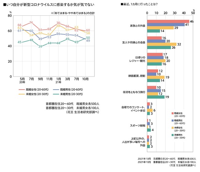 全国的な緊急事態宣言の解除後の2021年10月時点では、「家族との外食」が既婚男女で4割、「友人や同僚との会食」は未婚男女で3割程度と高めになっています。「日帰りのレジャー・観光」や「宿泊をともなう旅行」をした人は各属性で1~2割と、慎重に行動している様子がうかがえます。