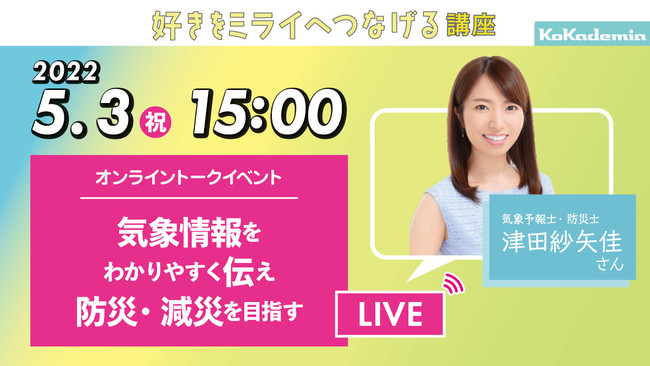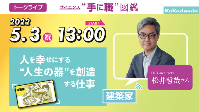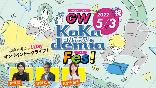 5月3日(祝)には、起業家、建築家、気象予報士の3名のセンパイが登場するオンライントークライブ『GWコカデミアフェス!』を開催。3人のお話を通して、自分が好きなこと、得意なことを仕事にする道について考えていきます。各回、前半は講演会、後半は気になることを直接聞ける質問・相談コーナーとなります。