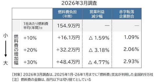 株式会社帝国データバンクは、保有する企業データベースのうち2025年1月-26年1月までに決算を迎えた企業財務データを対象に、ガソリン・軽油など「燃料費」の高騰に対する企業業績への影響度について試算・分析を行った。各平均値は、上下各5%、計10%のトリム平均値を使用した。