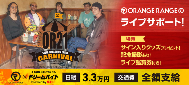 ディップ株式会社(以下「当社」)は、『その経験が夢につながる』をコンセプトとした「ドリームバイト」の新企画として、2022年5月15日(日)に開催される、『ORANGE RANGE ㊗21周年! スーパーウルトラちゅらちゅらカーニバル』の神奈川・ぴあアリーナMM公演をサポートするアルバイトを募集開始しました。