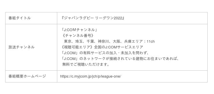 JCOM株式会社(J:COM、本社:東京都千代田区、代表取締役社長:石川 雄三)は、2022年1月7日(金)に開幕するラグビー新リーグ「NTTジャパンラグビー リーグワン2022」のDIVISION 1、2の試合を地域単位で編成している、J:COMのコミュニティチャンネル「J:COM チャンネル」で放送いたします。