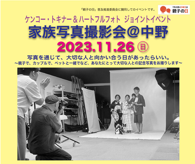 株式会社ケンコー・トキナー(本社:東京都中野区、代表取締役社長:山中 徹)は、家族の絆をテーマに結婚、子ども誕生、親子の写真の撮影を行っている「Heartful Photo」による「家族写真撮影会」を開催。開催日時は2023年7月16日(日)。ケンコー・トキナーサービスショップ内撮影スタジオ(東京都中野区中野5-68-10)にて実施いたします。