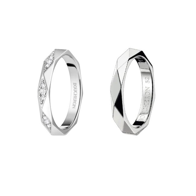 「ブシュロン」 ファセット リング ミディアム ハーフパヴェ(プラチナ、ラウンドカットダイヤモンド24石〈計0.20ct〉幅:2.8 mm)583,000円、ファセット リング ミディアム(プラチナ、幅:2.8 mm)279,400円