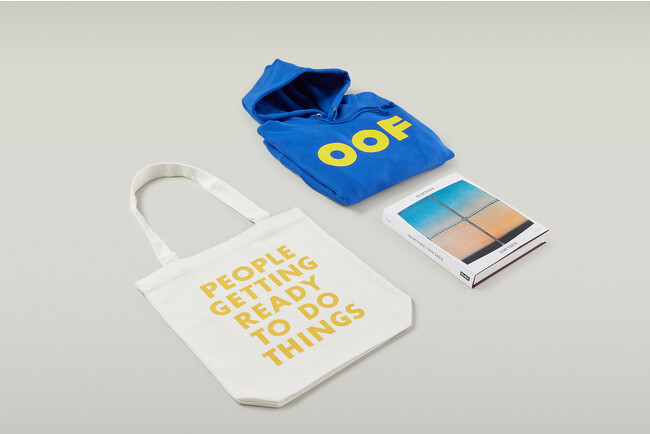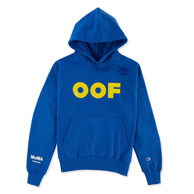 「私を夢中にさせた1つの言葉、しゃがれた1音節の発音 "OOF"("ウッ"といううめき声)」と彼が語った作品が、ブライトイエローの文字と共に、Championのパーカーで復活しました。文字以外の部分には、作品にあるブリリアントブルーが一面に使用されています。パーカーの右袖にMoMAロゴとEd Ruschaの文字がプリントされ、左袖にはChampionロゴが施されています。※10月20日発売