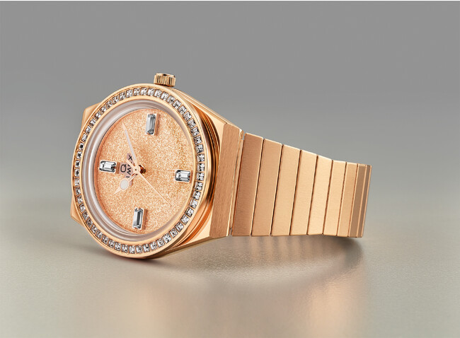 ダイヤモンドダストをイメージした光の反射でキラキラと輝く文字盤、プリンセスカットのクリスタルをふんだんに施したベゼル、バゲットカットのクリスタルのインデックスを12時、3時、6時、9時位置に配置し、煌びやかでエレガントなデザインに仕上げました。
