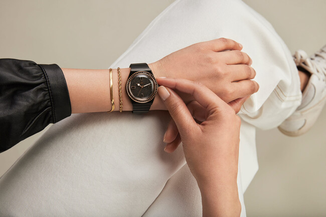 機械式から電池式(クォーツ)へ本格的に移行する時期に発売された同モデルは、赤と青に塗り分けられたアルマイト加工の回転式ベゼル、コインを使ってユーザー自身で電池を交換できるハッチ・ケースバック構造、織り込みのステンレス・スチールブレスレット、そして当時先端技術であったクォーツ・ムーブメントの頭文字”Q”を文字盤のブランドロゴの上に配したダイアルなど、そのままに再現しています。