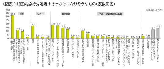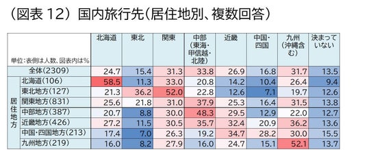 国内旅行を実施すると答えた人に対し、旅行先を決めるきっかけになりそうなものを聞いたところ、「自然が楽しめる場所(国立公園や花畑など)」が31.4%と最も高く、またカテゴリー別ではテーマパークなどを含む「観光施設」が軒並み高い傾向となりました(図表11)。また現時点で考えている旅行の行き先について聞いたところ、「中部(東海・甲信越・北陸)(33.8%)」が最も高く、次いで「九州(沖縄含む)(31.7%)」、「関東(31.3%)」となりました。北海道と九州は居住地域と旅行先が同じ域内旅行が多い傾向が見られる一方で、関東地方や近畿地方などから北海道・九州・沖縄などの遠方を訪れる人も相応にみられます(図表12)。