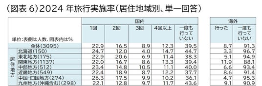 今回実施した旅行に関するアンケート調査によると、2024年1月~12月の1年間で1泊以上の旅行を実施した人の割合は、国内旅行については「1回」が22.9%、「2回」が16.5%、「3回」が8.9%、「4回以上」は12.3%で、6割以上の人が国内旅行を実施しました。性年代別に見ると、国内旅行を実施した人の割合は「女性29歳以下(80.7%)」が最も高く、次いで「女性30代(72.1%)」、「男性29歳以下(69.4%)」、「男性30代(67.2%)」となり、若い世代、特に女性の実施率が高い結果となりました(図表4)。居住地域別にみると、国内旅行を実施した人の割合は「中国・四国地方(63.9%)」が最も高く、次いで「近畿地方(62.2%)」、「東北地方(61.8%)」となりました(図表6)。