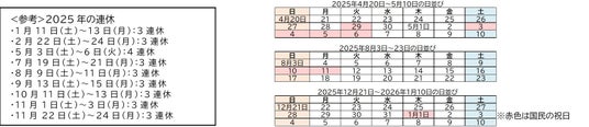 2025年のカレンダーは、3連休以上が9回あります。2024年は11回だったので、2回の減少となります。GWは後半(5月3日(土)~6日(火))が4連休となり、前半(4月26日(土)~29日(火))は4月28日(月)を休めば4連休となります。夏休みは、お盆期間の平日(8月12日(火)~15日(金))を休むと8月9日(土)~17日(日)の9連休になります。2025年~2026年の年末年始は、12月29日(月)~31日(水)を休めば12月27日(土)~1月4日(日)の9連休になります。