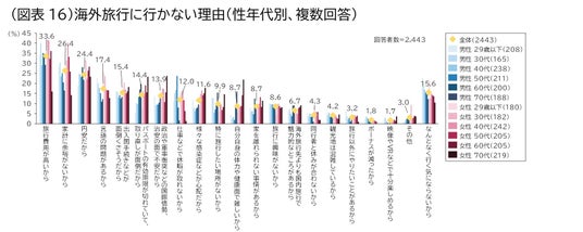 一方で、海外旅行に「一度も行かない」と答えた人は78.9%でした。その理由を聞いたところ、最も割合が高いのが「旅行費用が高いから(33.6%)」、次いで「家計に余裕がないから (26.4%)」、「円安だから(24.4%)」とこちらも経済的な理由が上位となりました。性年代別では、女性70代では「パスポートの有効期限切れ」、「治安の面での不安」、「自身の体力面の不安」、男性50代では「仕事などで休暇が取れないから」が上位になるなど、ライフステージによる違いもみられます(図表16)。