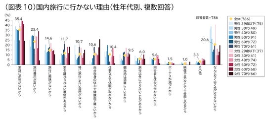 一方で、国内旅行に「一度も行かない」と答えた人は25.4%でした。その理由を聞いたところ、最も割合が高いのが「家計に余裕がないから(35.4%)」、次いで「旅行費用が高いから(23.4%)」、「旅行に興味がないから(14.6%)」となりました。予算面の厳しさが引き続きみられます(図表10)。