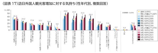 このような状況を踏まえ、今回のアンケート調査対象者に、訪日外国人観光客増加に対する気持ちについて聞いたところ、歓迎する声としては「日本経済全体の活性化につながるので歓迎だ(34.2%)」の割合が最も高く、特に29歳以下・30代・40代の男性、女性は50代で高い結果となりました。次いで「地方経済の活性化につながるので歓迎だ(23.2%)」、「観光地に賑わいが出てくるので歓迎だ(17.8%)」となりました。一方、懸念する声としては「観光地でのマナーが悪くならないか不安だ(43.4%)」の割合が最も高く、次いで「観光資源・施設、自然などがダメージを受けないか不安だ(31.9%)」、「住んでいる人の生活に影響が出ないか不安だ(31.3%)」となり、いずれも男女ともに50代以上で高い傾向がみられます。若い世代ほど、経済活性化や地域の賑わいにプラスになるなど前向きな捉え方をしている様子がうかがえます(図表17)。