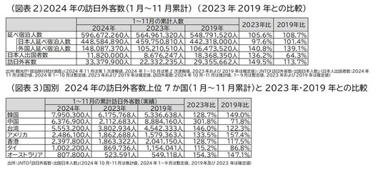 国内旅行について、2024年は前年に実施された観光支援策の終了や国内の物価高などの影響により、宿泊者数は伸び悩みとなっています。2024年の延べ宿泊者数をみると、1~11月の累計は4億4,858万人泊で、2023年同期(4億5,975万人泊)と比べると97.6%、2019年同期(4億4,232万人泊)と比べると101.4%となっています(図表2)。