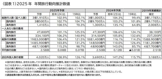 JTBは、2025年の旅行動向見通しをまとめました。当調査は、1泊以上の日本人の旅行(ビジネス・帰省を含む)と訪日外国人旅行について、各種経済指標や消費者行動調査、運輸・観光関連データ、JTBグループが実施したアンケート調査などから推計したもので、1981年からより継続的に調査を実施しています。2025年の調査結果は、次のとおりです。