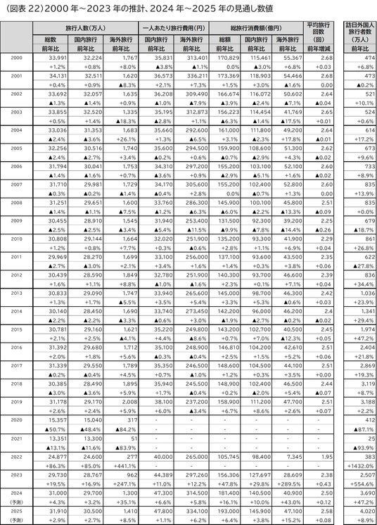 国内旅行者数は2000年~2023年までは実績推計値、2024年・2025年は推計値 海外旅行者数と訪日外国人旅行者数は2000年~2023年までは実績値、2024年・2025年は推計値