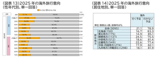 前述のアンケート調査によると、2025年1月~12月の1年間で1泊以上の海外旅行を実施する意向について聞いたところ、「行く予定」と答えた人は21.1%となりました。2024年の旅行実施率が8.7%であったことを考えると、大幅に増加しているといえます。性年代別にみると、「女性29歳以下」が34.3%と最も高く、次いで「男性29歳以下 (27.5%)」、「男性30代(26.0%)」となりました(図表13)。