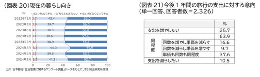 日本銀行が実施している「生活意識に関するアンケート調査」の「現在の暮らし向き」をみると、2024年9月は「ゆとりが出てきた」の割合が2022年12月以降最も高く、一方で「ゆとりがなくなってきた」が最も低くなっており、暮らし向きはゆるやかながら改善される傾向がみられます(図表20)。また、前述のアンケート調査において「旅行に行く」と答えた人に、「今後1年間の旅行の支出に対する意向」を聞いたところ、「支出を増やしたい(25.7%)」が「支出を減らしたい(10.5%)」を上回っており、旅行への支出拡大が見込まれます(図表21)。