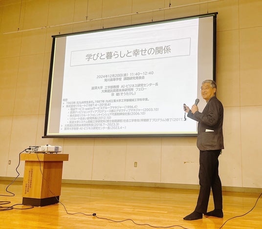 課題研究発表会では、人口減少や賑わいの創出が課題となっている近隣の市や町について、調査データを活用しグループごとに考えた活性化対策が生徒から発表されました。その後、当社賃貸未来研究所フェローの宗健 麗澤大学教授が、研究発表への講評と、「学びと暮らしと幸せの関係」と題する特別講演を行いました。