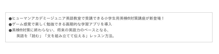 ヒューマンホールディングス株式会社の事業子会社で、教育事業を運営するヒューマンアカデミー株式会社(本社:東京都新宿区、代表取締役:川上 輝之、以下、当社)は、当社が展開する子ども向けの教育事業、ヒューマンアカデミージュニアSTE“AMスクール英語教室より、新・小学生英検(R)講座が登場します。