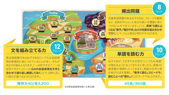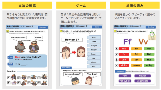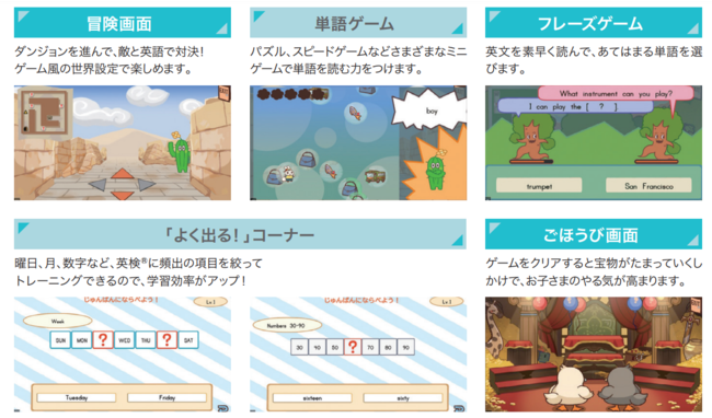 タブレットアプリは、5級頻出の単語と文で構成されており、さらに「文字」と「音」のセットで英検(R)対策ができる、ゲーム感覚で楽しく学べる画期的な内容となっています。