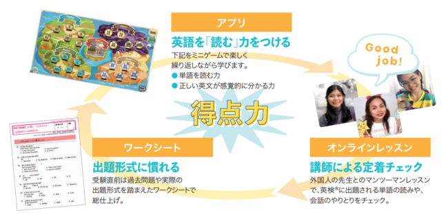 本講座では、「アプリ」「オンラインレッスン」「ワークシート」の3部構成になっており、文字や、頻出の英単語や文章に繰り返し、何度も触れていただくことで、お子さまが耳から聞いた英語の文字に結び付けるスピードを上げ、本番の試験での得点力アップに繋げられるようなレッスンの流れになっています。