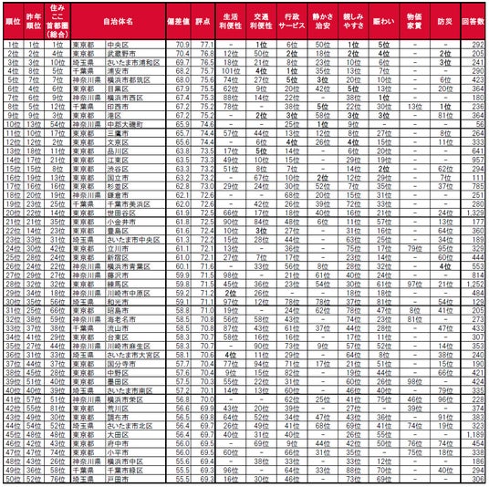 1位は4年連続で東京都中央区で、「住みここち<首都圏版>」でも1位の高い評価を得ています。2位は、2年連続で東京都武蔵野市です。3位は、3年連続で埼玉県さいたま市浦和区です。トップ10内では、神奈川県中郡大磯町が昨年13位から順位を上げて10位となっています。神奈川県中郡大磯町は、「住みここち<首都圏版>」では54位ですが、子育て世帯からの評価は高くなっています。