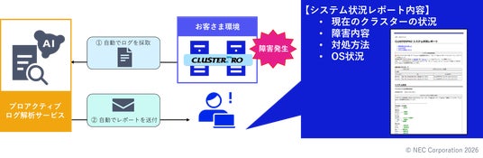 なお、障害発生後、すぐに初期対処法をレポートする「プロアクティブログ解析サービス」も2026年8月頃(注3)を目途に提供する予定です。従来は障害発生から解決までの間で障害ノードを特定し、ログを送付するまで平均約10時間(注4)を要していました。本サービスでは、障害発生からログ送付までを自動化し、ログ分析に当社AIを活用することで、初期対処法のレポートを即時送付できるようになります。これにより人手を介することなく障害発生時の運用が可能となり、初動対応開始までの時間を最小化します。