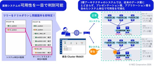 NECは、国内シェアNo.1(注1)のHAクラスタリングソフトウェア「CLUSTERPRO」シリーズにおいて、従来のサーバー単位だけでなく、システム全体の可用性を可視化する「システムHA」の概念を反映した新バージョン「CLUSTERPRO X 6.0」を本日から販売開始します。
